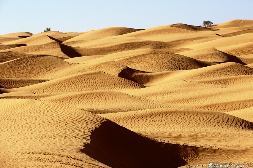 We start at 7:10 in the morning, running from the oasis Ksar Ghilane across the Sahara to the settlement Douz. The dunes begin just as we leave the oasis.