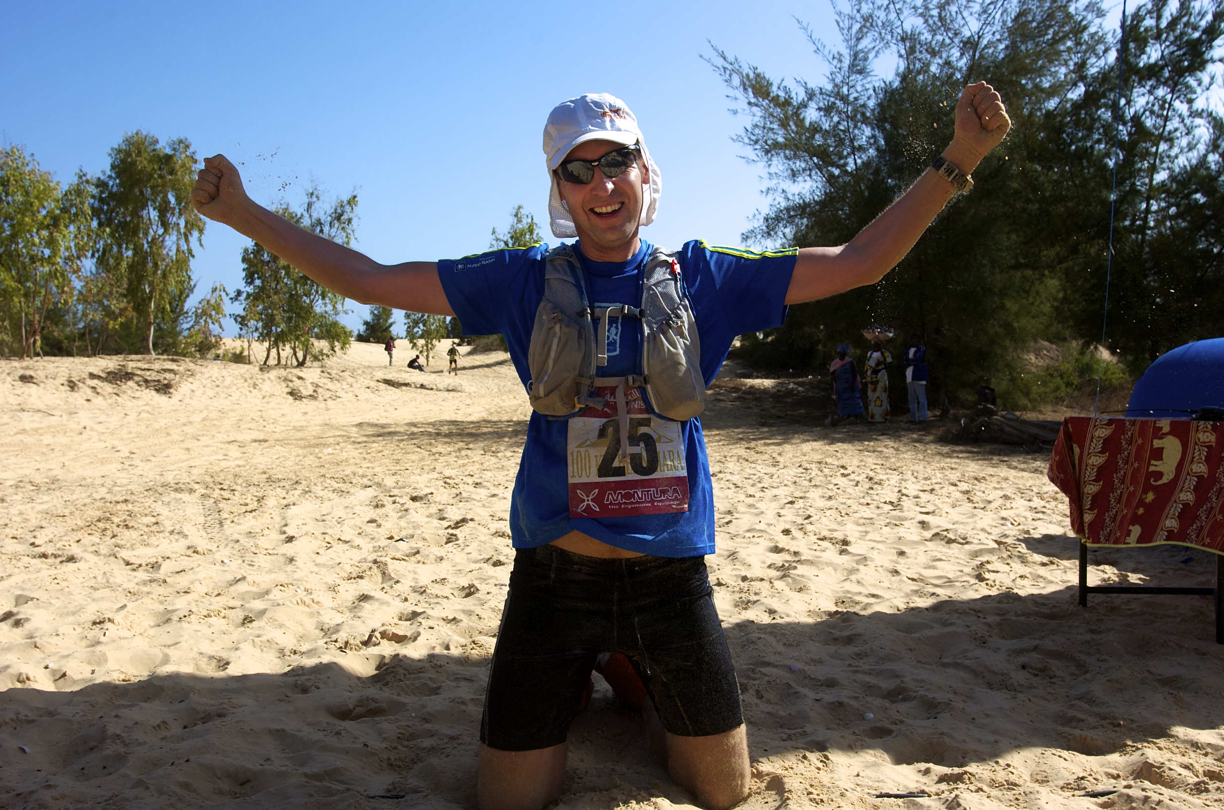 We transfer to an interesting hotel at Lac Rose (Red Lake), where we are put into nice round bungalows, each equipped with large canopy bed and a bathroom. The Red Lake is a salty lake in the very vicinity of the ocean where you can lay effortless on water without sinking. The last, fourth stage is 20km again, a big chunk of it run in the dunes and on the ocean beach. It is also the course where the Paris Dakar Really used to finish, before they moved it to Argentina. At the starting line, just 5 minutes before the start I realize I forgot my starting number in the room and have to run back to find it and then attach it. I almost miss the start and practically run half a kilometer longer than needed today. We go around the lake and then on the other side between the lake and the ocean, through the dunes and along the shore, then again through the dunes to the finish. I don’t have the same motivation today. Apparently, I am enjoying it too much, breathing the air of success, sucking in this exceptional atmosphere, the emotions, burning this unique experience into my brain. I know the heavy preparation has paid off. The moment I reach the finish line all the hassle, all the grinding will be over and I will be able to rest, relax and look back at what I have achieved.
