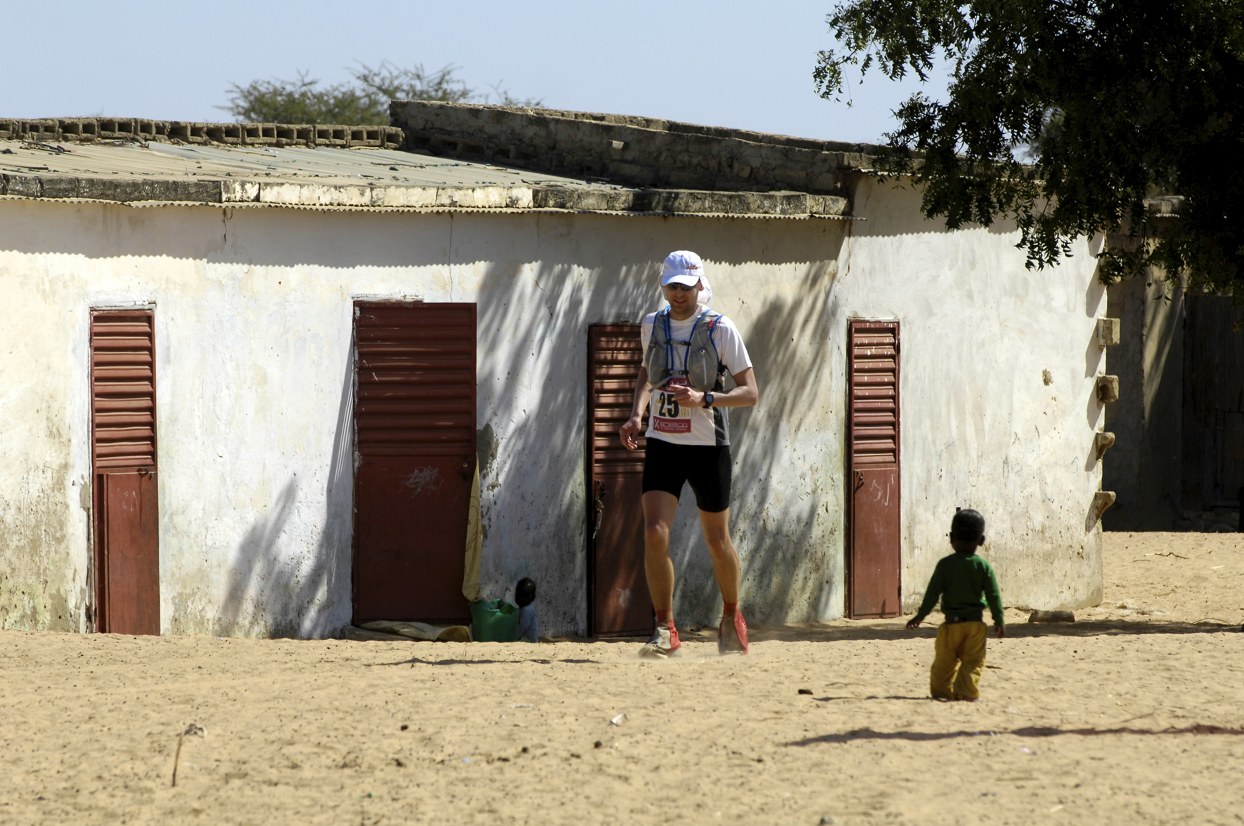 I decide to run with a speed way below my normal marathon speed. I discipline myself not to run faster than 7 min/km for the first half of the marathon. It looks like the Russian participant Alex Kirill has the same strategy. We run together, pass some villages with huts made of sticks on the way, like in the African picture book. We high-five the hands of many children in these villages. Entire school classes took free to greet us running through their village. It is a seldom event for them. We run through a splendid african landscape of Sahel, an unforgetable beautiful, but also very dry area.