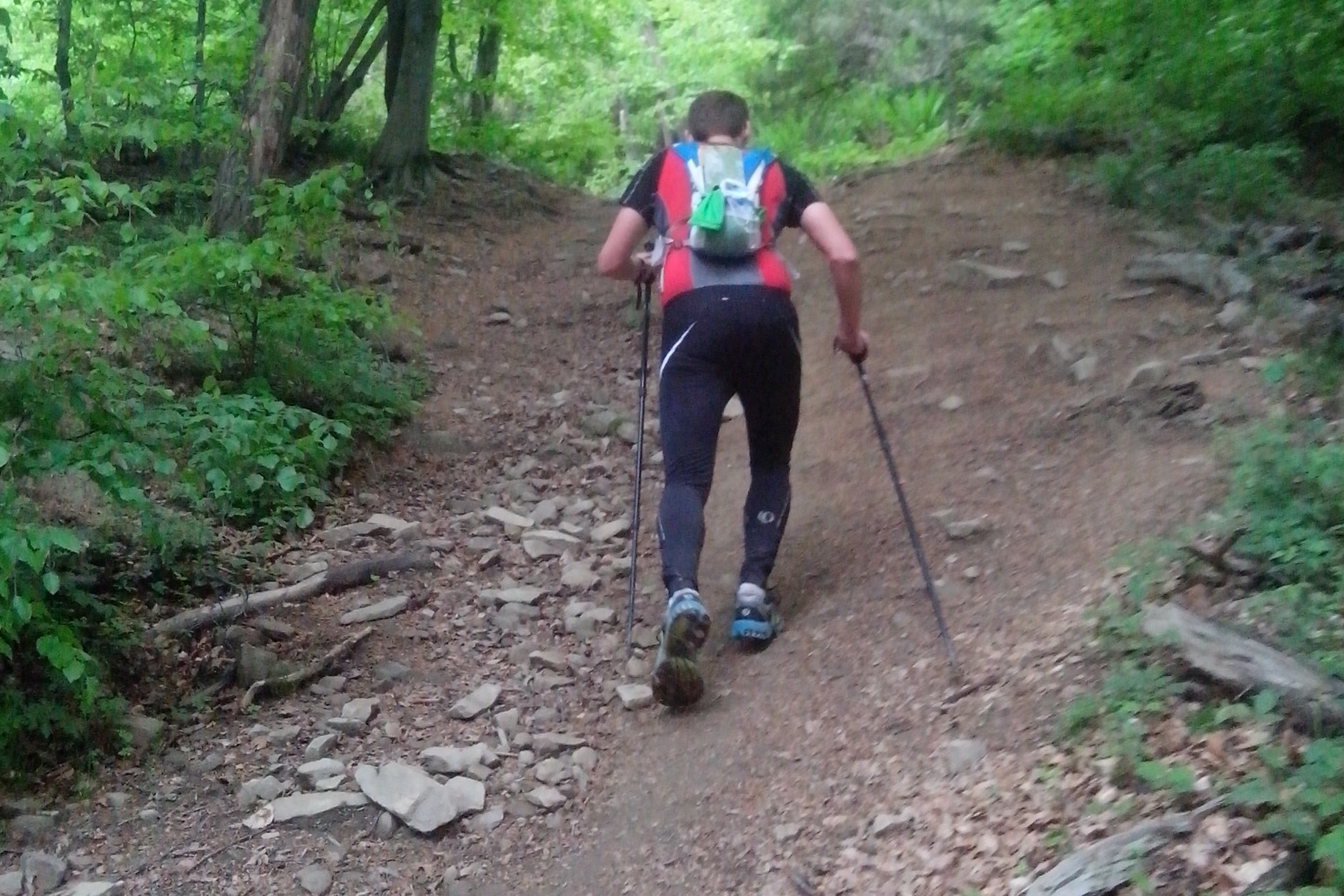 The trail turns out to be a total wilderness. It is difficult not to get lost and in fact we get lost several times during the test. Jack has seemingly trouble with the mountains, especially the descents. He hasn’t been training in the mountains much and the only time he was, he overdid it and needed to pause. Now he tries his alternative descent strategies (sideward, with the toes outside, etc.) which bear high risk of injury and some of his ligaments and joints get overtaxed during the long and hasty descents.